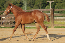 Das Füchschen mit den vielen weißen Stichelhaaren auf dem dicken Hinterteil war eines der kräftigsten und agilsten Fohlen, die bisher bei uns das Licht der Welt erblickten.