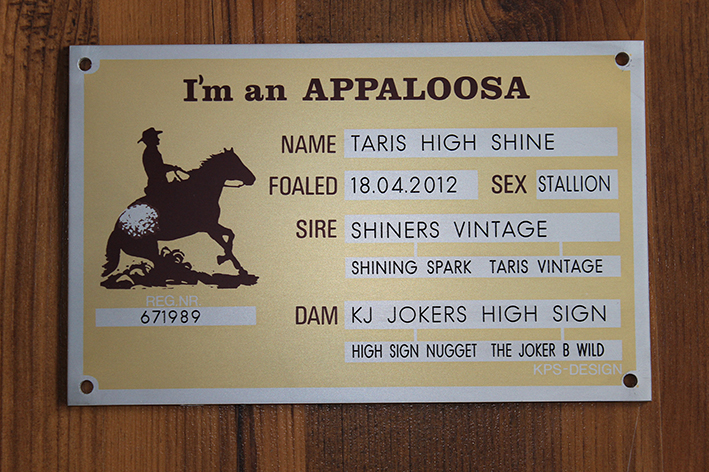 TARIS HIGH SHINE führt zu 47% feinstes Appaloosa Blut -sein erweitertes Pedigree verweist vielfach auf den bedeutendsten Gründerhengst von Appaloosa Performance Pferden MANSFIELDS COMANCHE sowie auf dessen Züchter JACK MANSFIELD. Weiterhin sind die Vererber JOKER B, WILD HOPE, PRINCE PLAUDIT, TOP HAT H sowie HIGH HAND und HANDS UP, DAWNDEE sowie WAR DON (alle ApHC Hall of Fame) auf dem erweiterten Papier zu finden.