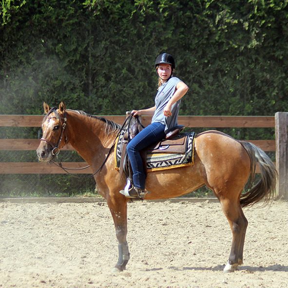 "Grete" wurde bei uns angeritten und ausgebildet. Sie lief im Reitunterricht und war ein sehr beliebtes Schulpferd. Unter Reitschülern "half" sie zuverlässig und brav zur Erlangung eines EWU Trainerscheins C und wurde unter verschiedenen Reitern auf diversen Kursen vorgestellt.