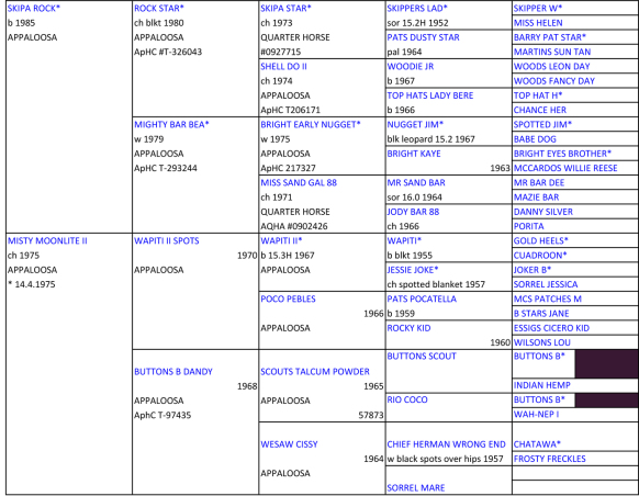 Ihre Abstammung geht insgesamt zehnfach auf MANSFIELDS COMANCHE zurück (alle ApHC Hall of Fame). In ihrem erweiterten Pedigree sind auch die Quarter-Horse-Legenden BERT, BILLY CLEGG, dreifach JOE HANCOCK, JOE REED, zweifach KING, sechsfach OKLAHOMA STAR, zigfach PETER MCCUE, zweifach SKIPPER W, sowie WIMPY sowie THREE BARS (alle AQHA Hall of Fame) zu finden.